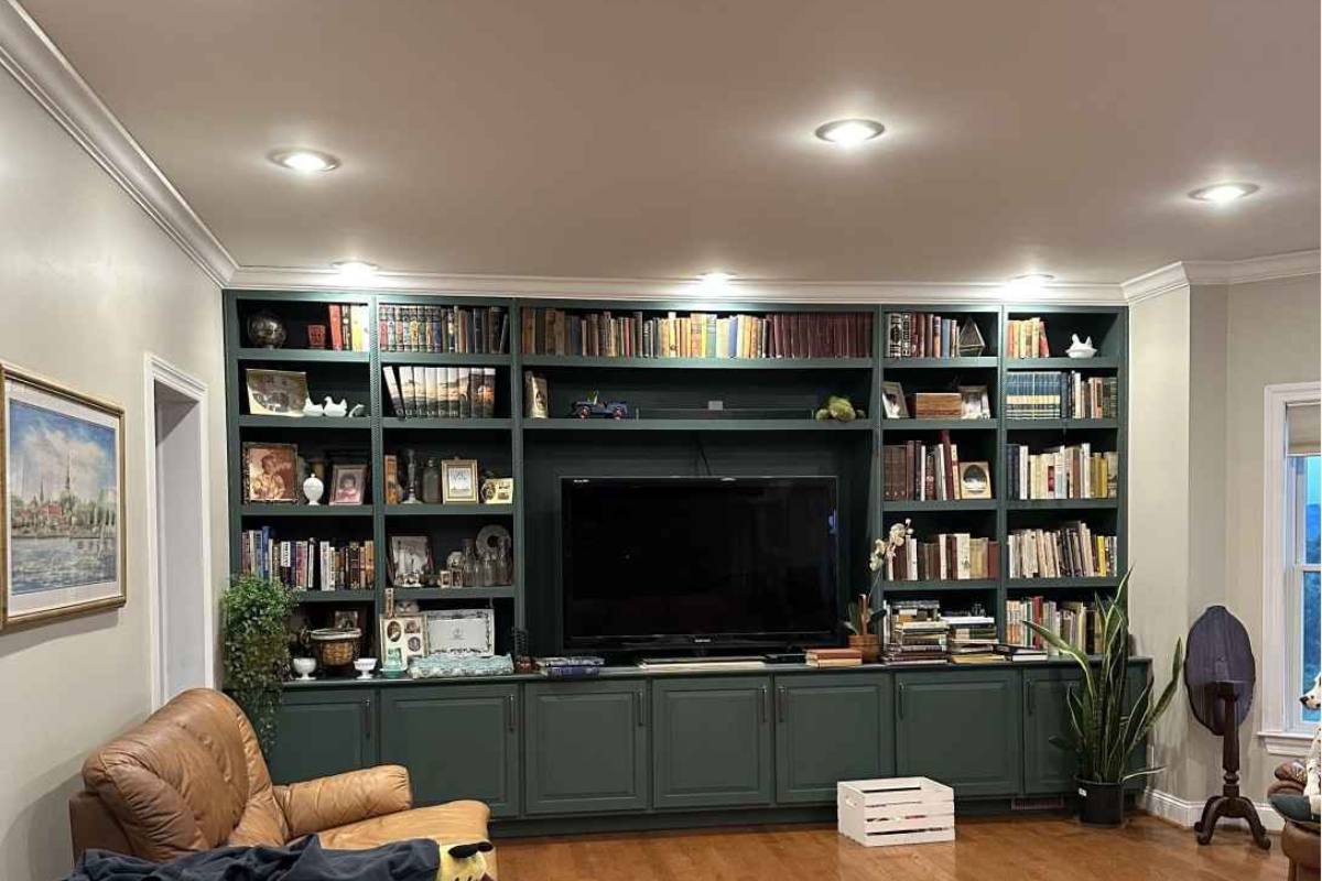 A imagem mostra uma sala de estar bem organizada e aconchegante. A parede principal é ocupada por uma grande estante de livros verde escura, que vai do chão ao teto, com várias prateleiras cheias de livros, objetos decorativos e algumas plantas. No centro da estante, há uma grande televisão de tela plana, e ao redor dela, diversas decorações e porta-retratos.