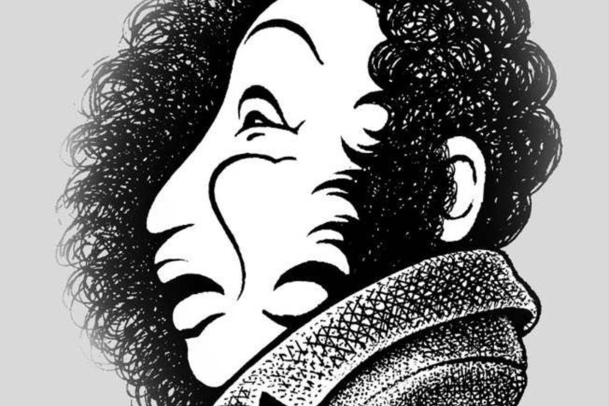 A imagem apresentada é um retrato intrigante que inicialmente parece mostrar o perfil de um homem com cabelo encaracolado e usando um terno. No entanto, esta imagem é uma ilusão de ótica e esconde um segredo visual: o rosto de uma mulher está habilmente oculto dentro do retrato do homem.