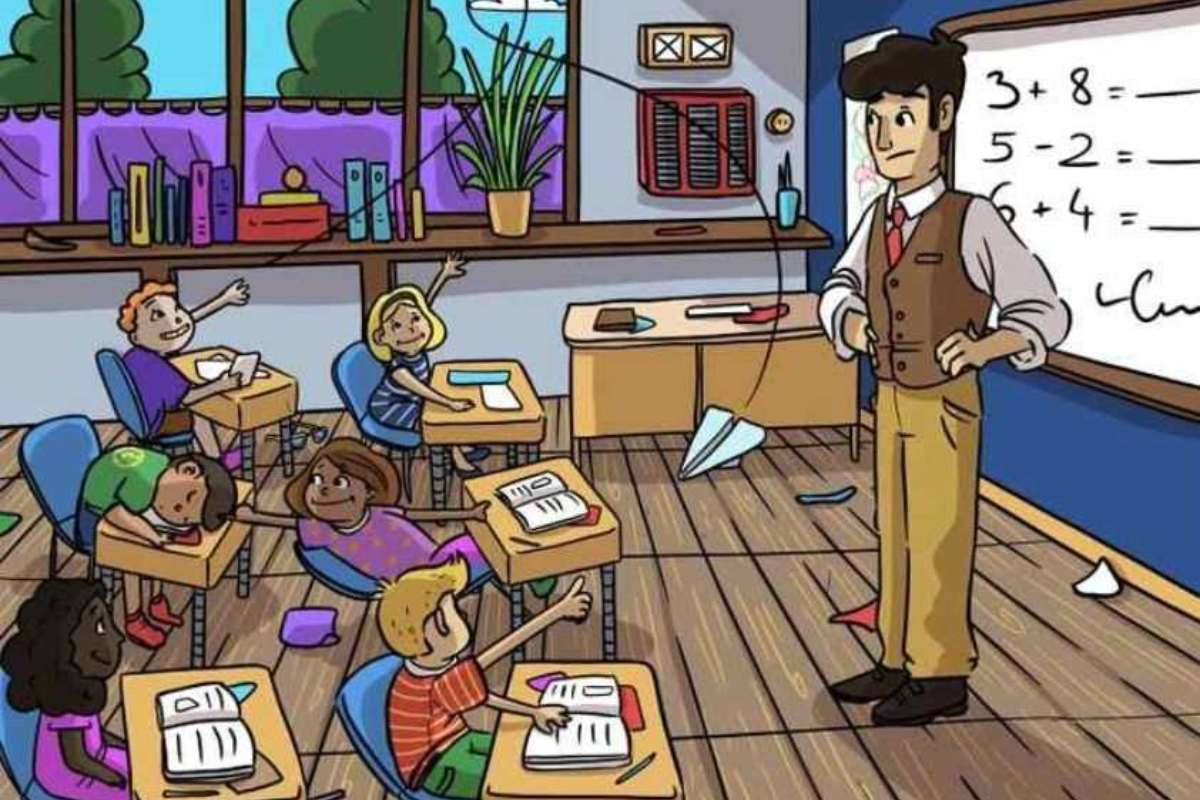 No entanto, há um par de óculos de leitura escondido nesta cena movimentada. Este é o desafio: você consegue encontrar os óculos de leitura escondidos em meio ao caos da sala de aula em apenas 15 segundos?