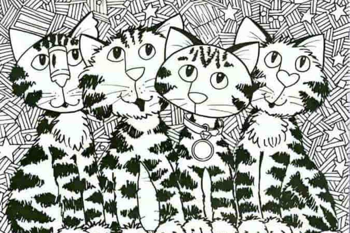 A imagem mostra quatro gatos fofos sentados lado a lado em um banco de madeira. O fundo está repleto de padrões complexos, incluindo estrelas, luas e vários objetos decorativos. Entre esses padrões intricados, há um peixe habilmente escondido.