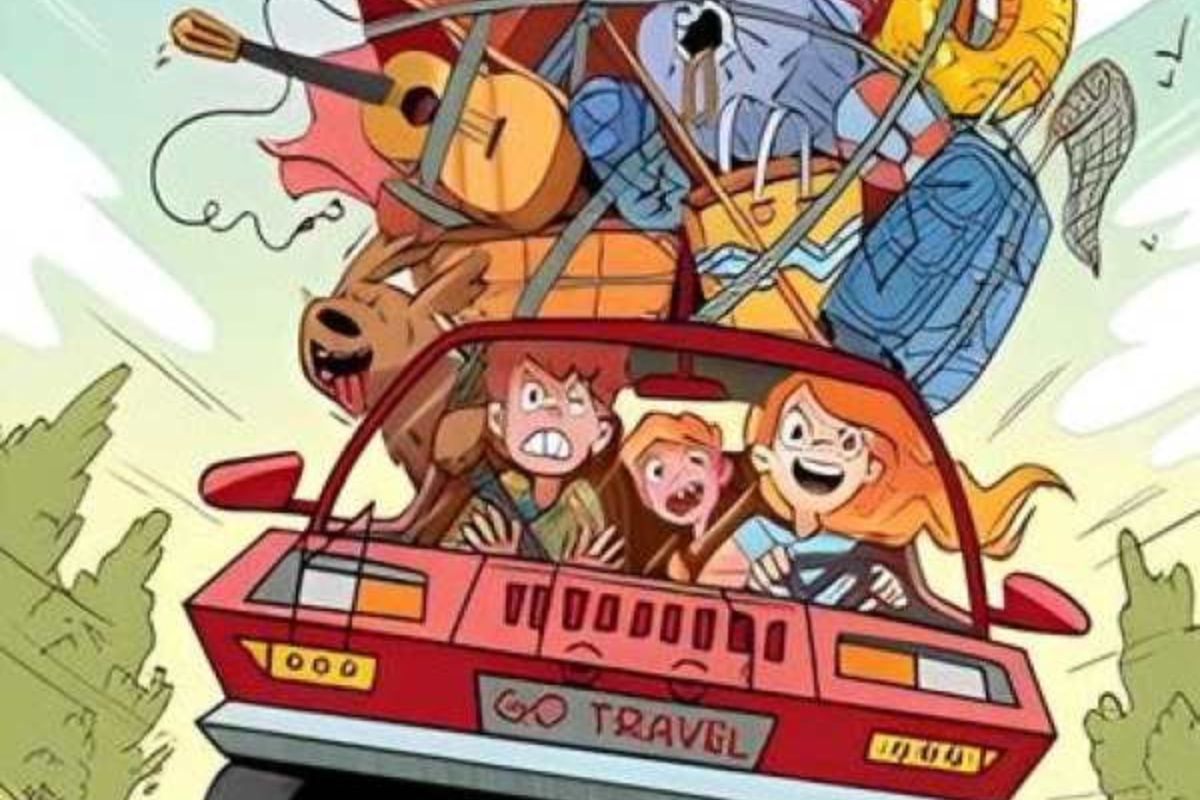 A imagem mostra uma cena divertida e caótica de uma família viajando em um carro vermelho com o teto cheio de bagagem. O carro parece estar em movimento, com a estrada embaçada ao fundo, dando a sensação de velocidade. A família dentro do carro exibe expressões de excitação e talvez um pouco de apreensão, enquanto uma variedade de objetos está empilhada de maneira precária no teto do veículo.