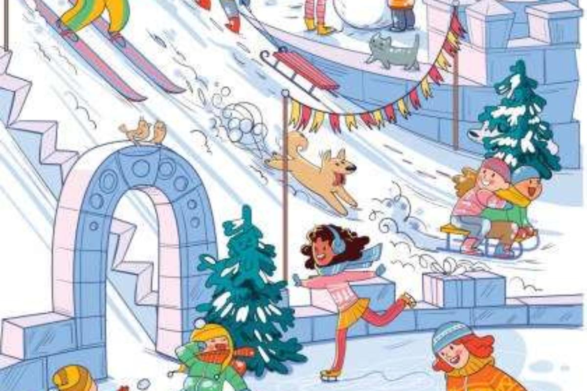 A imagem mostra uma animada paisagem de inverno, com várias pessoas se divertindo em atividades na neve. Vemos crianças e adultos patinando no gelo, construindo bonecos de neve e esquiando nas colinas nevadas. Há um cachorro correndo alegremente, e todos parecem estar aproveitando o dia frio ao ar livre. A cena é repleta de detalhes coloridos e vibrantes, criando um ambiente festivo e cheio de vida.
