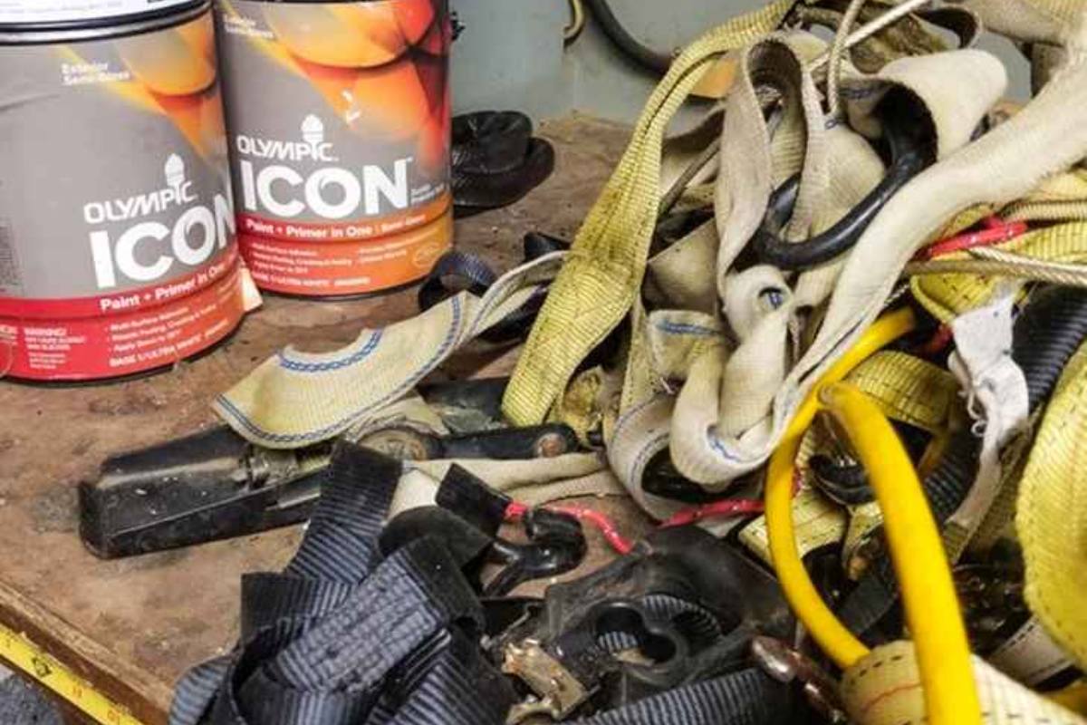 Na imagem abaixo, podemos ver uma prateleira cheia de latas de tinta, uma variedade de cordas e cintas amontoadas. Em meio a esse cenário de armazém desorganizado, há uma cobra escondida. A cobra está bem camuflada entre os objetos, tornando o desafio ainda mais interessante.