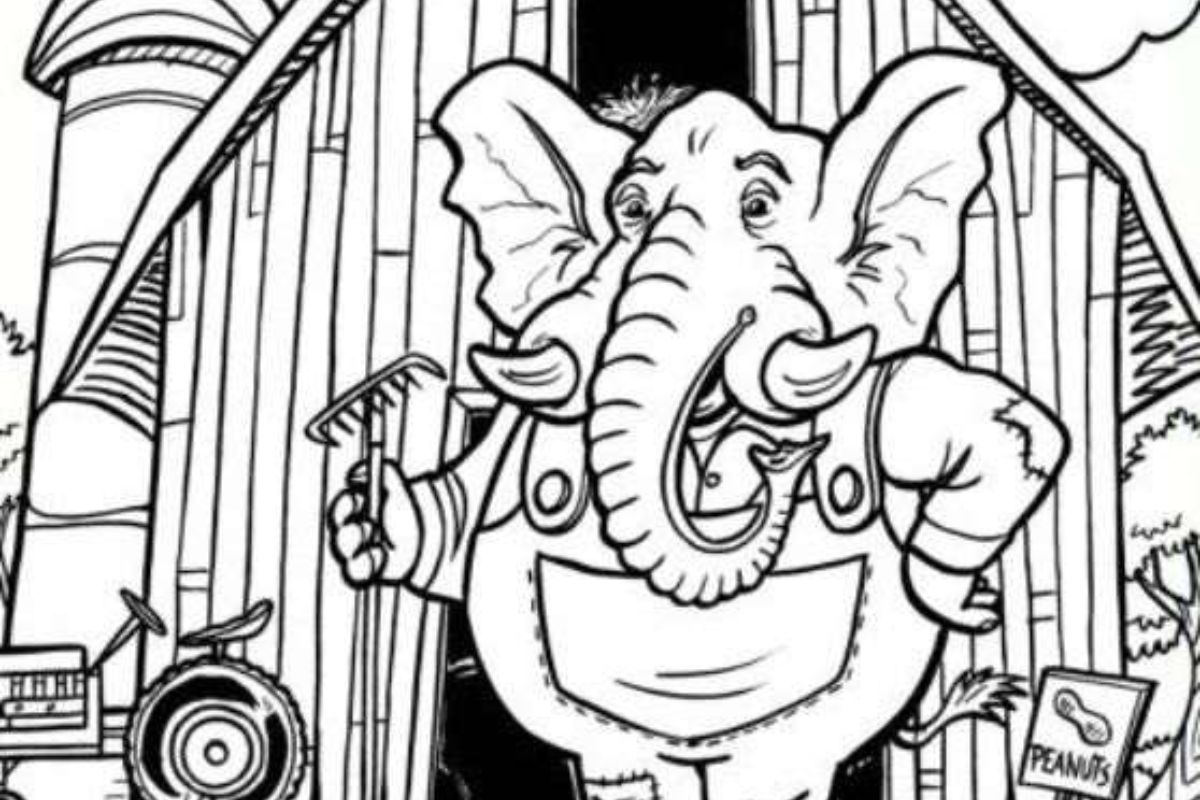 A imagem mostra um desenho em preto e branco de um elefante parado em frente a um celeiro. O elefante está usando uma jardineira jeans e o celeiro é feito de madeira. Neste cenário, você deve encontrar uma escova de dentes em 10 segundos, nós te desafiamos.