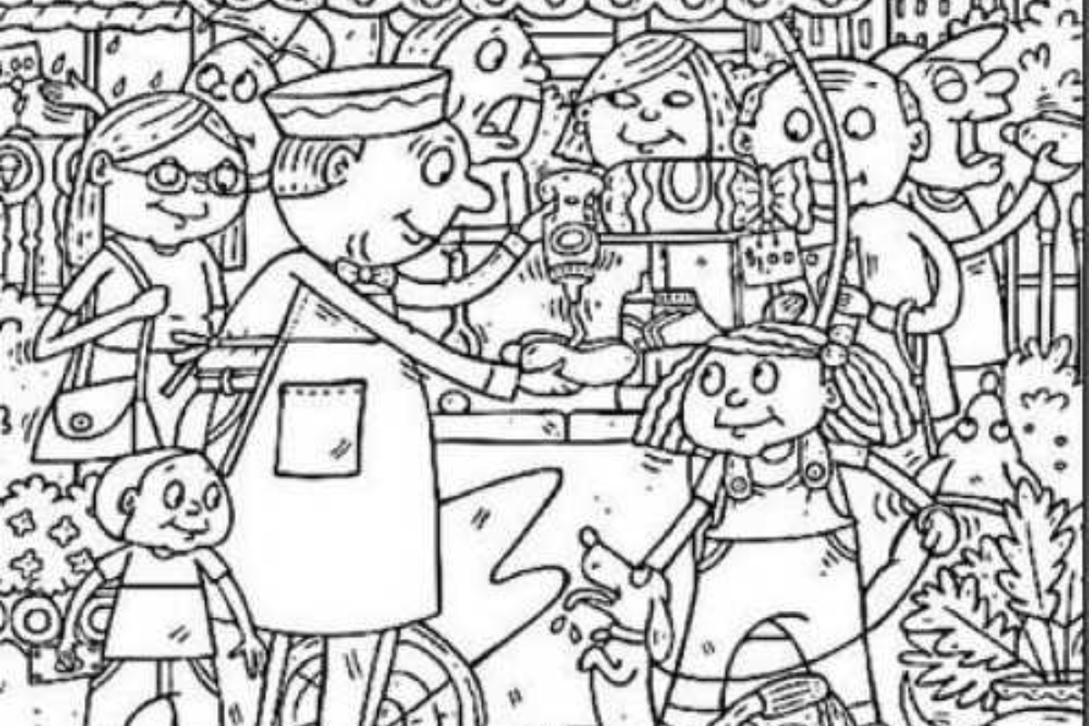 3. Olhe ao redor dos personagens principais: A estrela do mar pode estar disfarçada perto das figuras centrais, como o vendedor ou as crianças ao redor do carrinho de cachorro-quente.