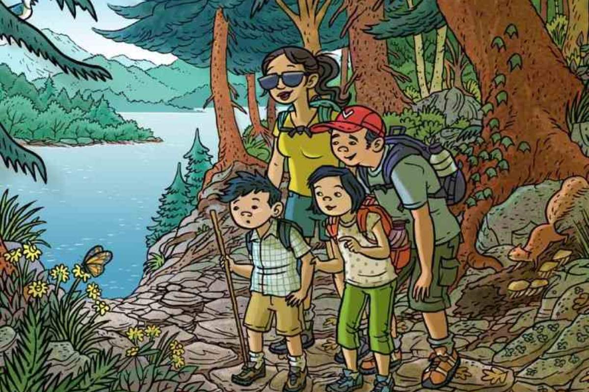 Na imagem, vemos uma família fazendo uma trilha na floresta. A mãe, de óculos escuros, o pai ao lado da mãe, de chapéu vermelho mostrando algo para a menina, sua filha, enquanto o outro filho observa atento na mesma direção dos outros. Todos estão carregando mochilas e o cenário é composto por árvores altas e densas, um caminho pedregoso e um lago sereno ao fundo. Flores amarelas e vegetação diversificada preenchem o primeiro plano, criando um ambiente natural e vibrante.