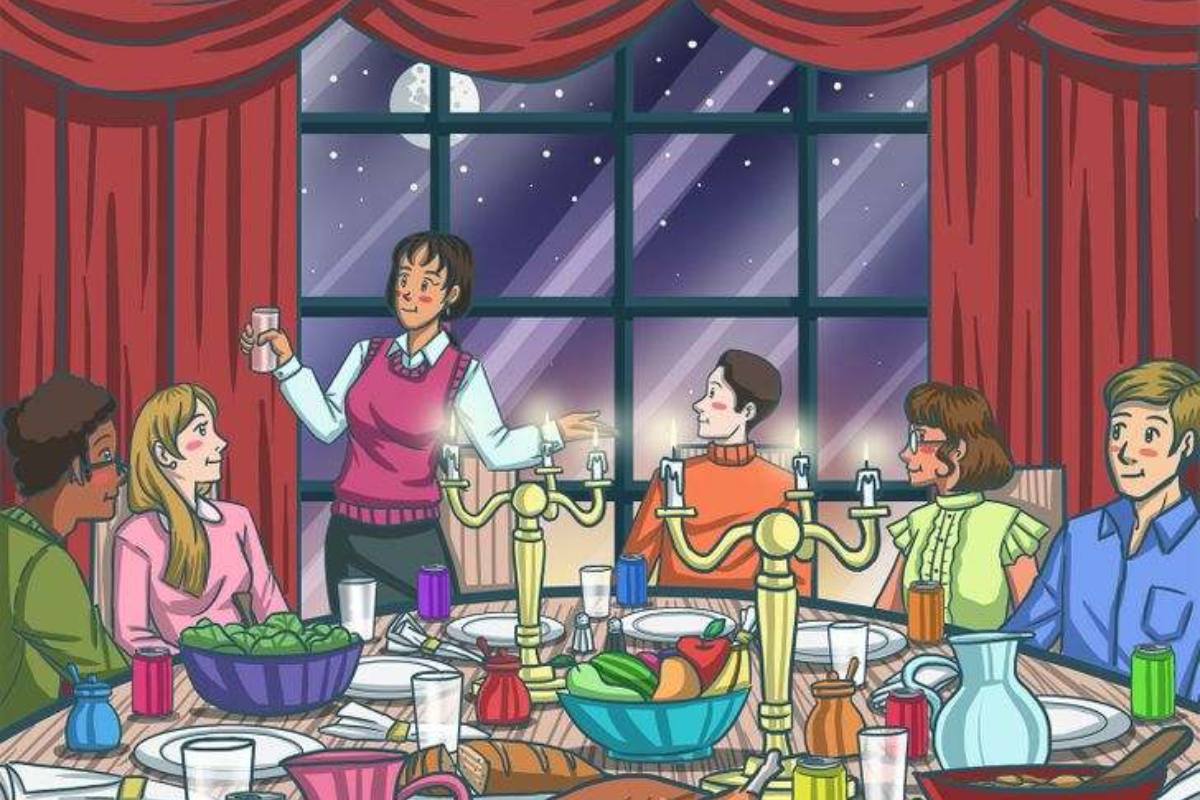 A imagem mostra uma cena de jantar elegante, onde várias pessoas estão sentadas ao redor de uma mesa cheia de pratos deliciosos e itens de decoração. O ambiente é aconchegante, com grandes janelas que mostram um céu noturno estrelado ao fundo, e cortinas vermelhas adornam as laterais da sala. Uma mulher, em pé, parece estar fazendo um brinde ou falando algo para os demais convidados, que a observam atentamente.