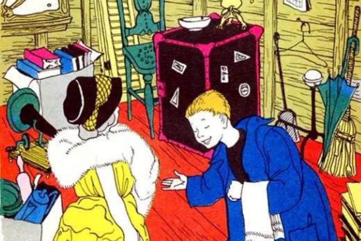 A imagem apresenta uma cena em um sótão colorido e cheio de objetos diversos. Três personagens são visíveis: uma mulher usando um elegante casaco de pele e um chapéu, uma menina segurando uma bolsa e um homem em um casaco azul que parece estar cumprimentando ou interagindo com elas. O sótão está repleto de itens como móveis, uma lâmpada, uma caixa de som, e outros objetos espalhados pelo chão, que incluem rolos de papel e uma vassoura.