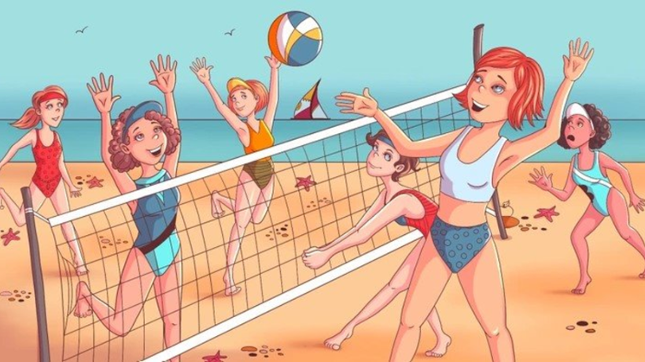 O sol está alto no céu, iluminando o local com seu calor suave. Meninas animadas estão jogando vôlei na praia, saltando e correndo na areia fofa. Um barco desliza suavemente pelas águas tranquilas, adicionando um toque de tranquilidade à cena.