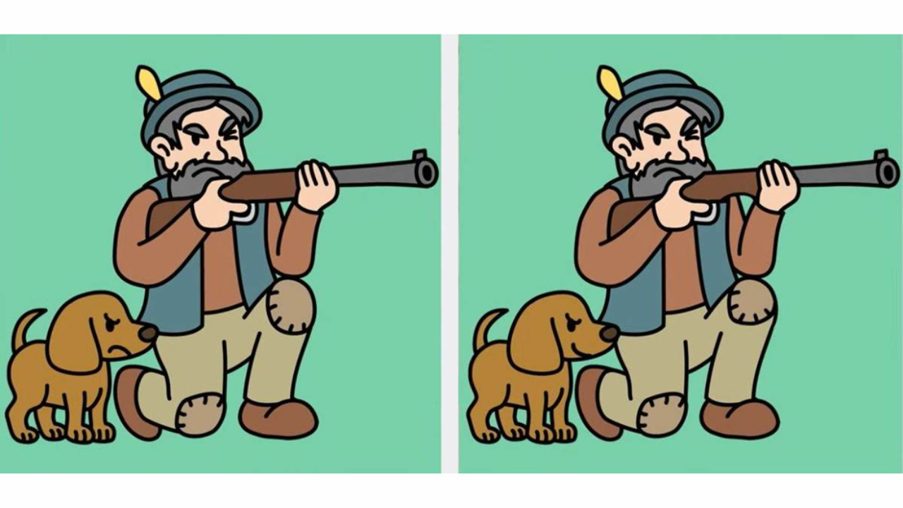 Aqui está a solução para o nosso desafio. As diferenças entre as duas imagens do caçador e seu filhote são sutis, mas observáveis com atenção e foco. Ao analisar as imagens, você pode perceber que as diferenças estão no rifle e no joelho do caçador e na expressão facial do cachorro. Confira: