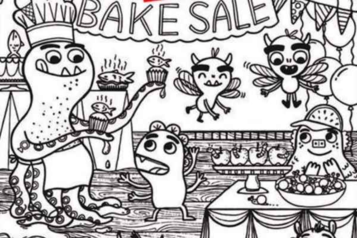 Na imagem, você vê uma animada cena de uma venda de bolos (“Bake Sale”) com vários personagens divertidos e criaturas fofas, todos desfrutando de diferentes doces e cupcakes. Há uma diversidade de figuras, desde um polvo com várias mãos servindo cupcakes até pequenos monstros voadores e outros seres engraçados. A cena é rica em detalhes e cheia de elementos que chamam a atenção.
