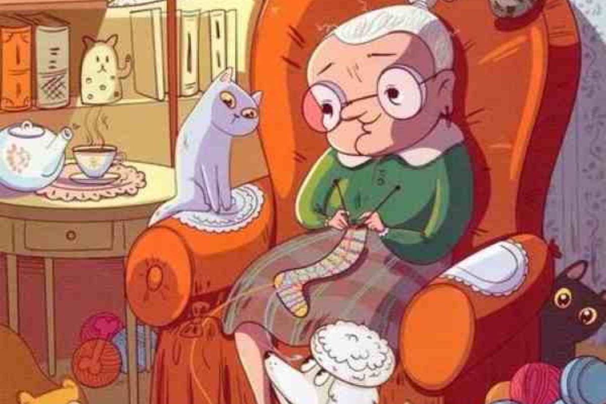 A imagem mostra uma cena acolhedora de uma senhora idosa sentada em uma poltrona, cercada por vários gatos. Ela está tricotando tranquilamente, enquanto os gatos brincam com novelos de lã ao seu redor. Há um abajur ao lado da poltrona e uma xícara de chá na mesa, adicionando um toque aconchegante ao ambiente. Atrás da senhora, há uma estante cheia de livros e quadros na parede.