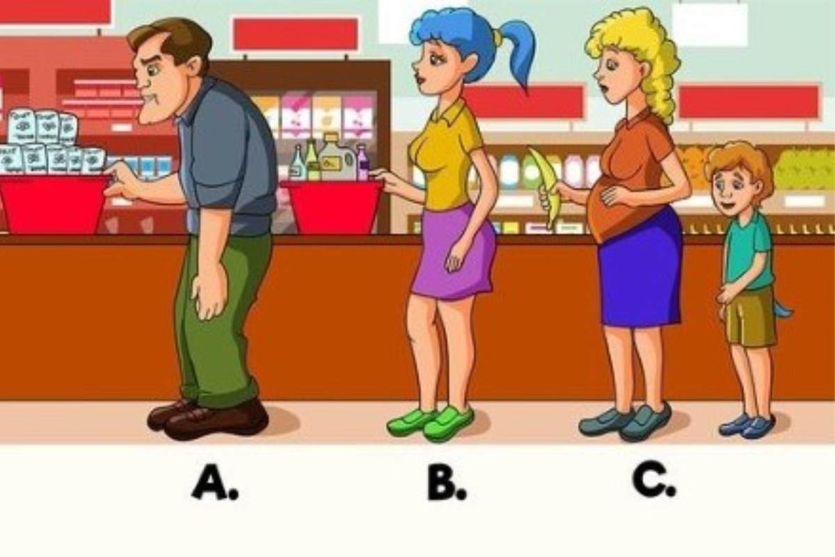A imagem mostra quatro pessoas em uma fila de supermercado, sendo três mulheres e um homem. O homem à esquerda, identificado como A, está inclinando-se para frente com uma cesta vermelha cheia de caixas. Ao lado dele, uma mulher com cabelos azuis, marcada como B, segura um produto e olha para frente. Em seguida, uma mulher grávida, C, está atrás dela, e, por último, há uma criança na fila, segurando a barra do vestido da mulher grávida.