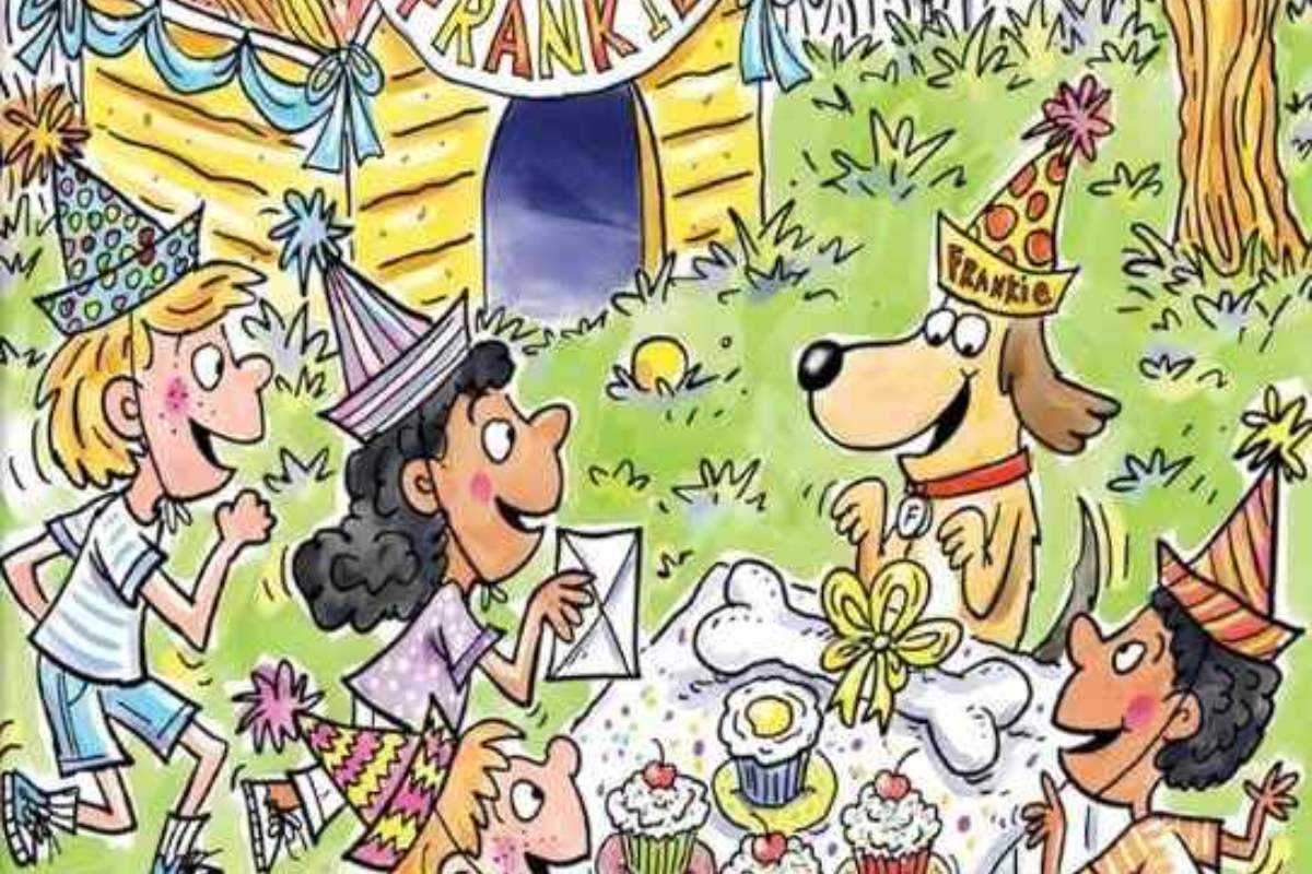 Na imagem, vemos uma alegre festa de aniversário ao ar livre para o cachorro Frankie. Quatro crianças estão reunidas ao redor de uma mesa decorada com cupcakes, usando chapéus de festa. Ao fundo, há uma casinha de cachorro com balões coloridos e uma faixa de “Happy Birthday Frankie”. O cachorro está sentado em frente à mesa, também usando um chapéu de festa, enquanto as crianças interagem animadamente.