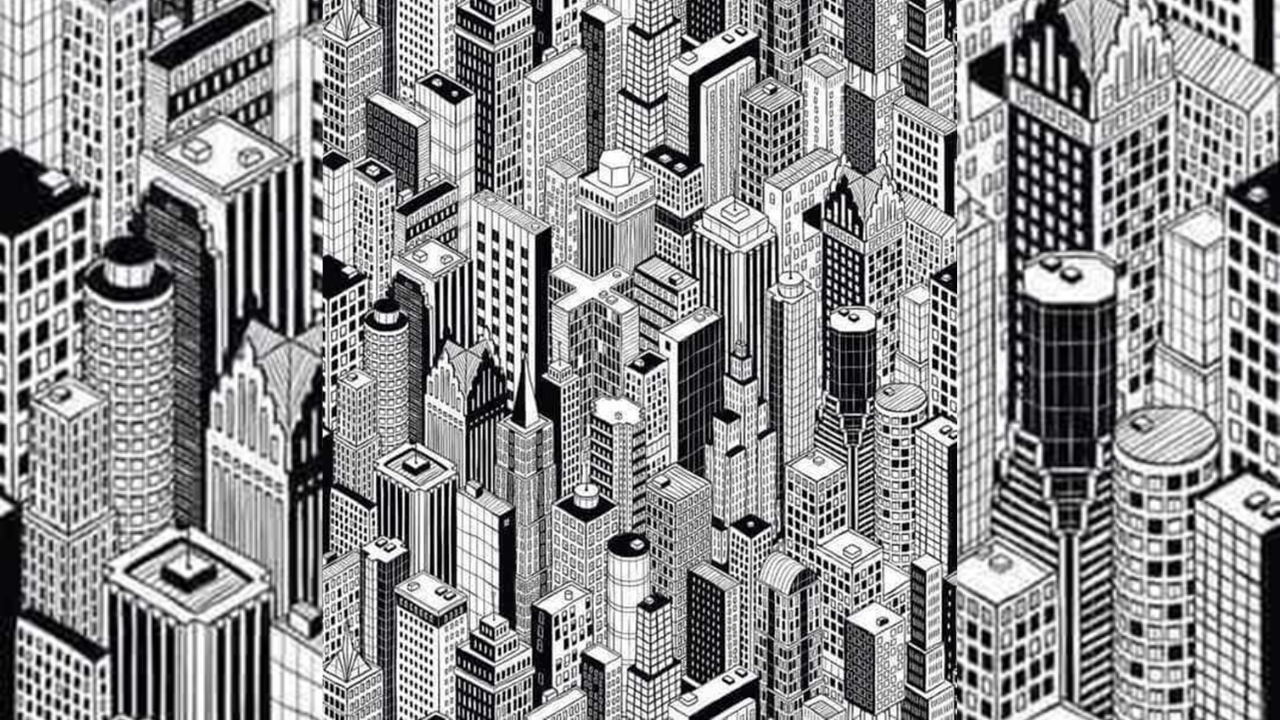 Diante de você está uma ilustração em preto e branco, apresentando vários arranha-céus. Em algum lugar nesta imagem, encontre o gato escondido rapidamente. Concentre-se, pois sua capacidade de observação será colocada à prova.