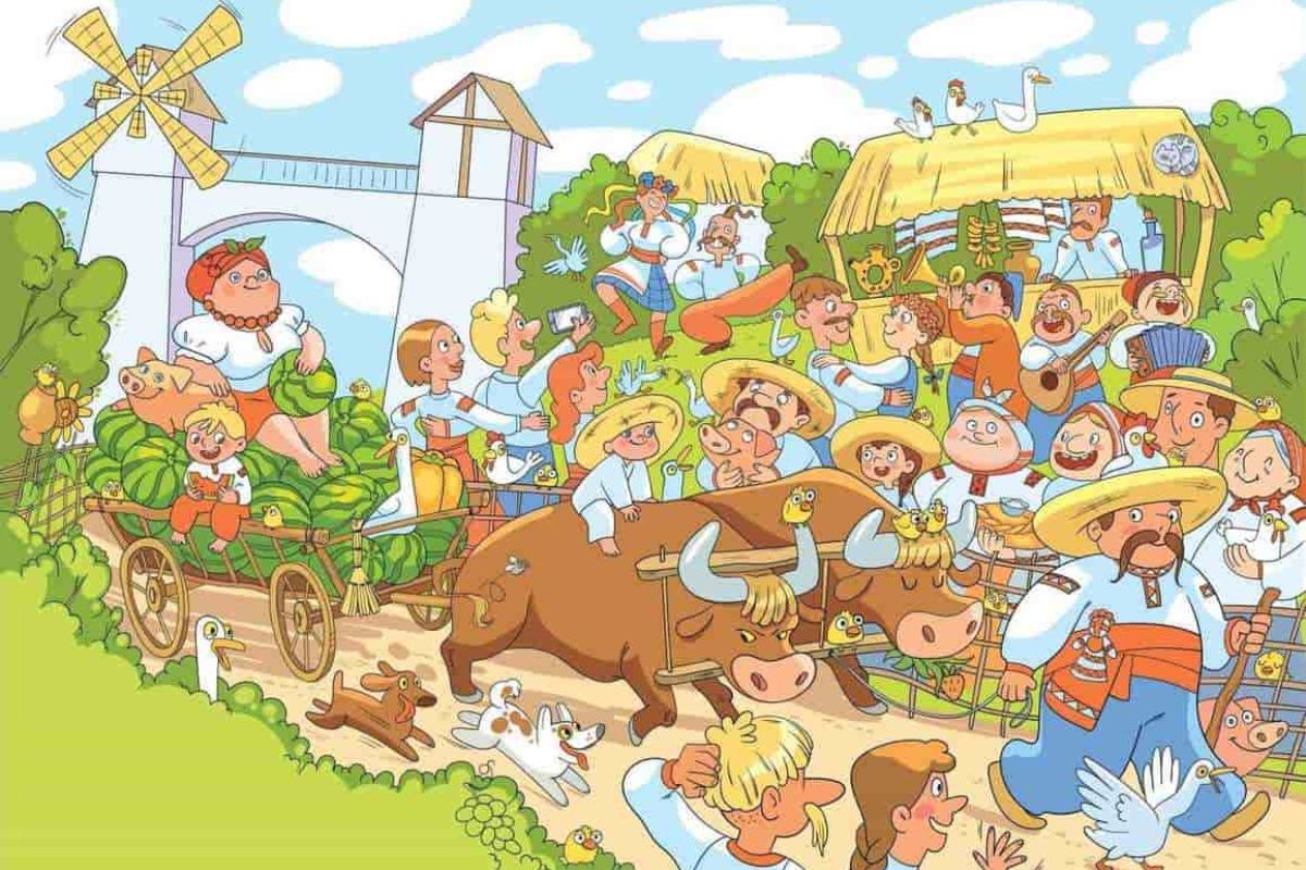 Na imagem abaixo, vemos uma cena vibrante de celebração, repleta de detalhes e personagens animados. As pessoas estão vestidas com trajes típicos e parecem estar participando de uma festa ao ar livre. Há dançarinos, músicos tocando instrumentos e muitas atividades acontecendo ao mesmo tempo. Vemos também uma carroça cheia de melancias, puxada por bois, e várias aves espalhadas pela cena.