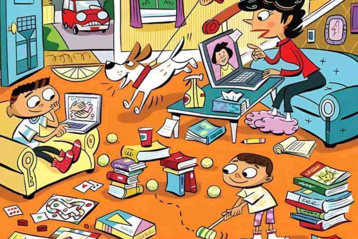 A imagem apresenta uma cena caótica dentro de uma casa, onde cada membro da família está envolvido em suas atividades. No canto esquerdo, um menino está sentado em um sofá amarelo, absorto em um jogo de computador. Ao centro, um cachorro branco e marrom salta animadamente, atravessando a sala.