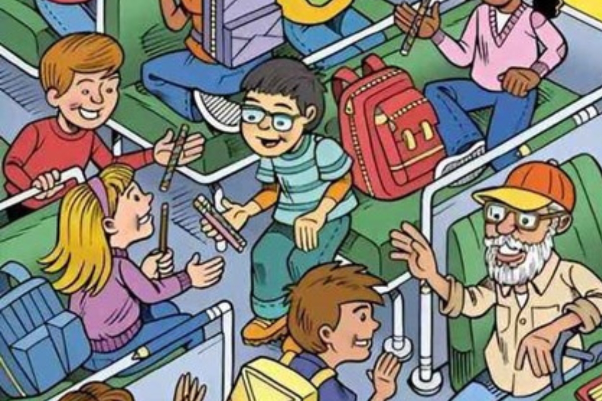 Na figura acima, você pode encontrar diversas pessoas com suas mochilas e outros itens como lápis e até uma maçã no canto direito da tela, não é mesmo? Mas, o seu desafio é encontrar um sino por mais improvável que esse item seja em relação à cena revelada. Visto que, por que encontraríamos um sino dentro de um transporte escolar, não é? Apesar do contexto, o enunciado afirma que esse objeto está presente e que pode ser visto em apenas 10 segundos.