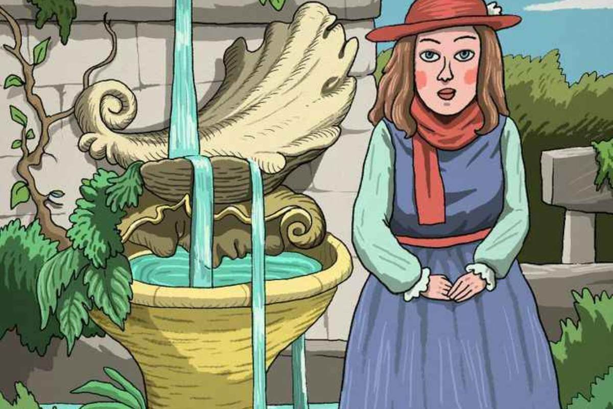 A imagem mostra uma mulher de chapéu vermelho e vestido longo, posicionada à frente de uma fonte com detalhes ornamentais e plantas ao redor. O ambiente parece ser calmo, mas o verdadeiro desafio está escondido nos detalhes da cena. Este é um clássico exemplo de ilusão de ótica onde, à primeira vista, tudo parece comum, mas há mais do que os olhos podem ver.