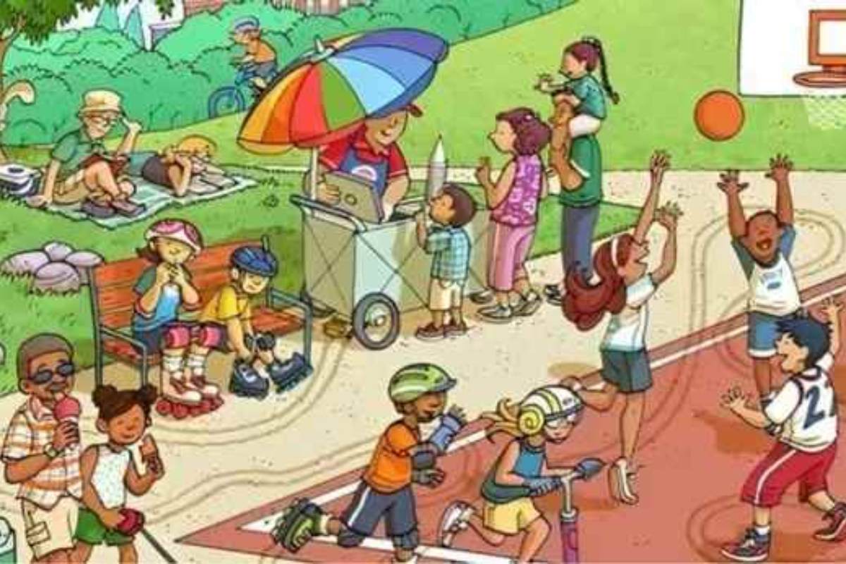 Na imagem, vemos uma cena movimentada em um parque. Crianças brincam em uma quadra de basquete, algumas patinam, e outras interagem perto de um carrinho de sorvetes. Ao fundo, pessoas relaxam em mantas, aproveitando um dia ao ar livre. Toda a cena é colorida e vibrante, o que pode dificultar a tarefa de encontrar o objeto escondido.