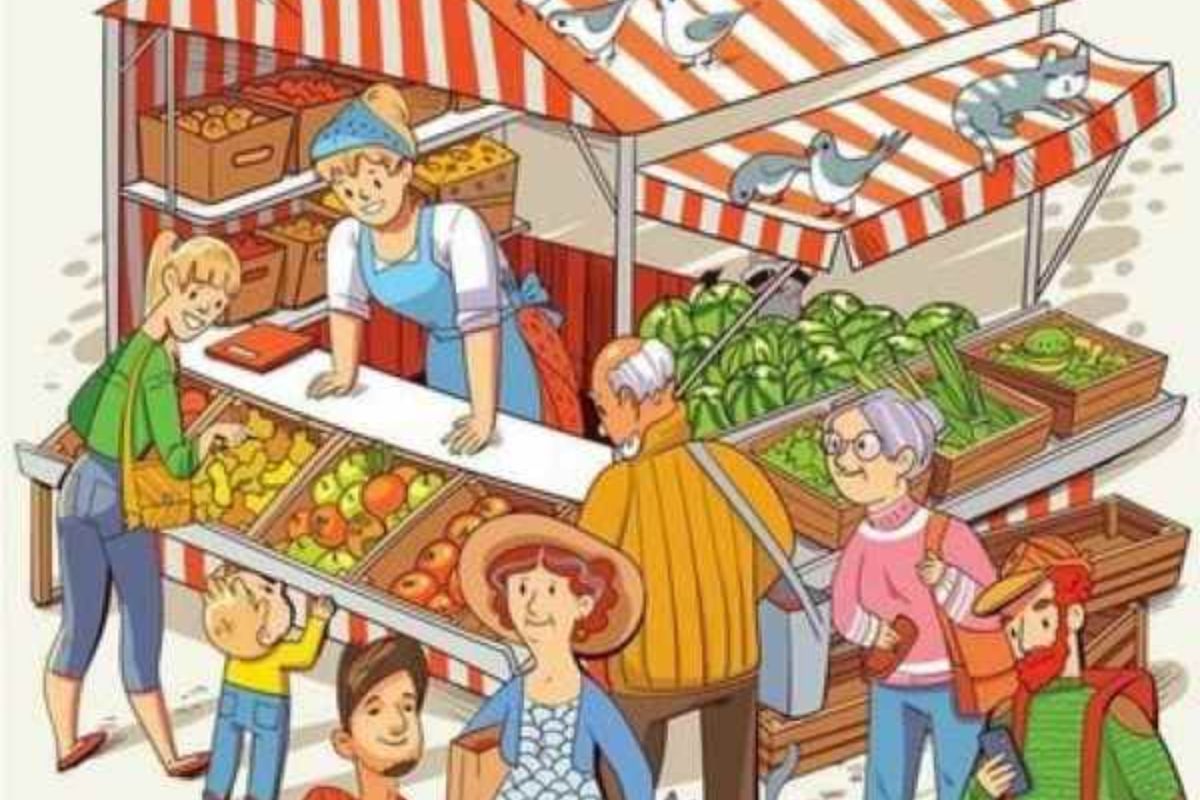 Entre os compradores, há um homem com uma sacola de vegetais, uma senhora de chapéu com uma sacola de compras, um menino com um brinquedo e várias outras figuras envolvidas em atividades típicas de um dia de mercado.