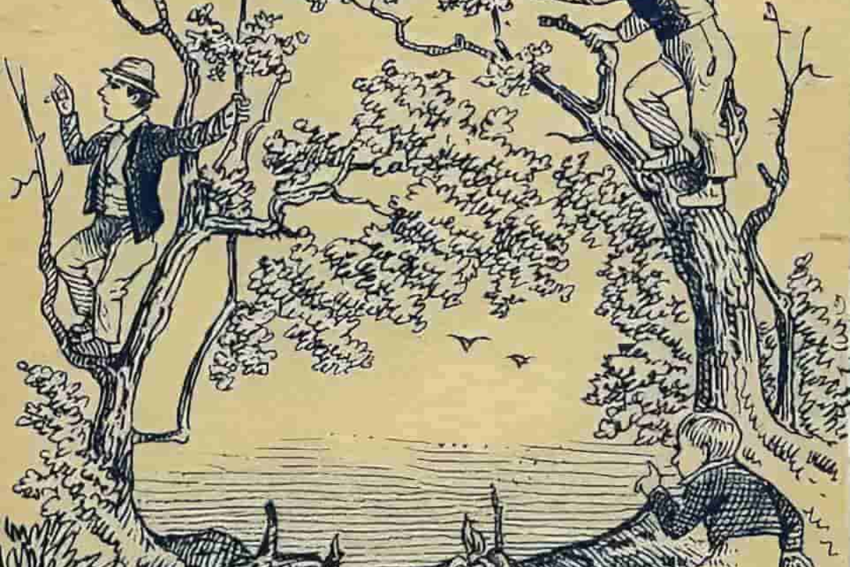 A imagem mostra uma ilustração detalhada com três meninos interagindo em meio a árvores. Dois deles estão subindo nos galhos — um parece alcançar algo no alto da árvore, enquanto o outro observa. Um terceiro menino está agachado próximo ao chão, olhando atentamente para algo no solo. Ao fundo, há um lago calmo e árvores que completam o cenário.