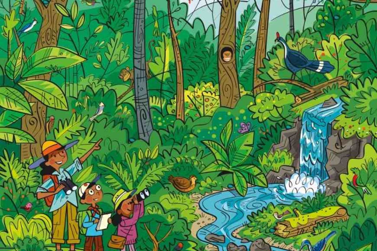 A imagem mostra uma cena vibrante e detalhada de uma selva tropical, onde uma mãe e seus dois filhos estão explorando a natureza. À esquerda, a mãe, vestindo um chapéu laranja e segurando um binóculo, aponta para algo no meio da vegetação. Ao seu lado, um dos filhos, com um chapéu amarelo e óculos, segura uma prancheta, enquanto a outra criança, também de chapéu amarelo, olha através de um binóculo.