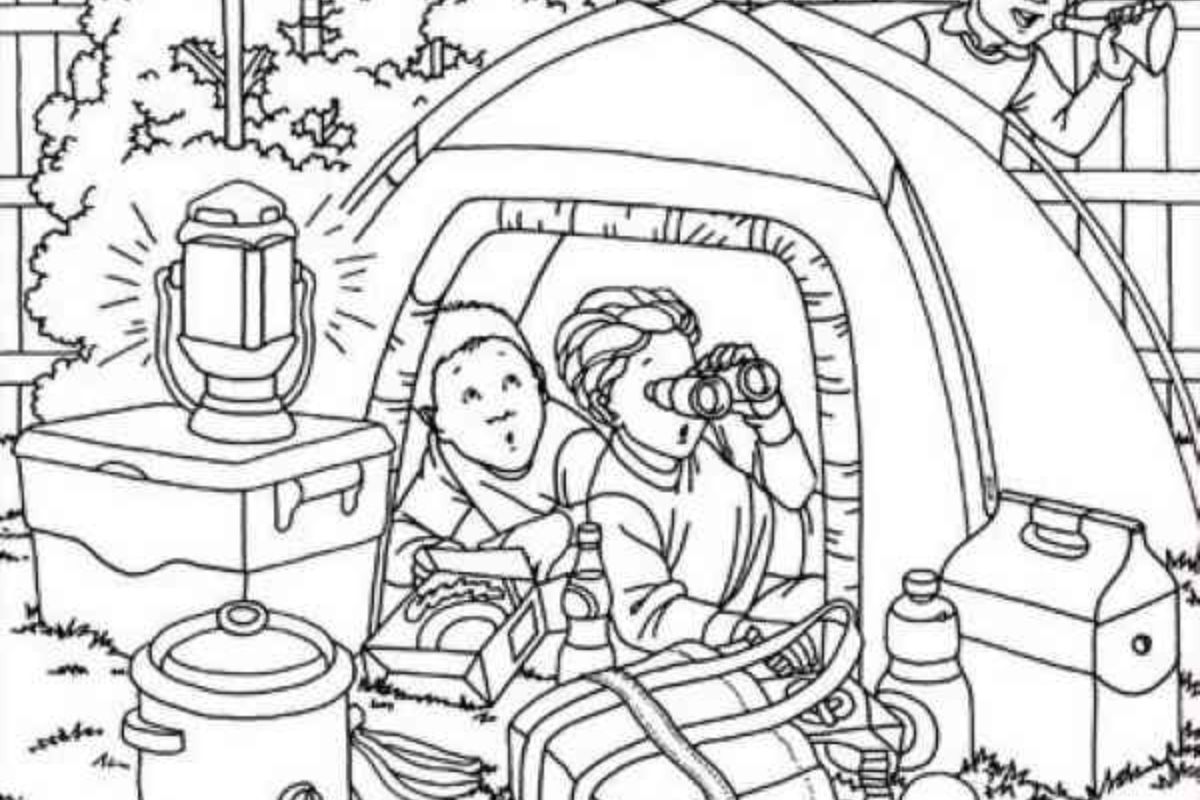 A imagem mostra uma cena de acampamento no quintal, onde duas crianças estão dentro de uma barraca. Uma delas está olhando através de binóculos, enquanto a outra parece animada com algo que encontrou. Fora da barraca, há diversos itens de acampamento espalhados, como uma lanterna, mochilas, garrafas, uma panela e outros equipamentos. Ao fundo, outra criança está espiando por cima da cerca de madeira que circunda o quintal, com árvores e uma casa visíveis ao fundo.