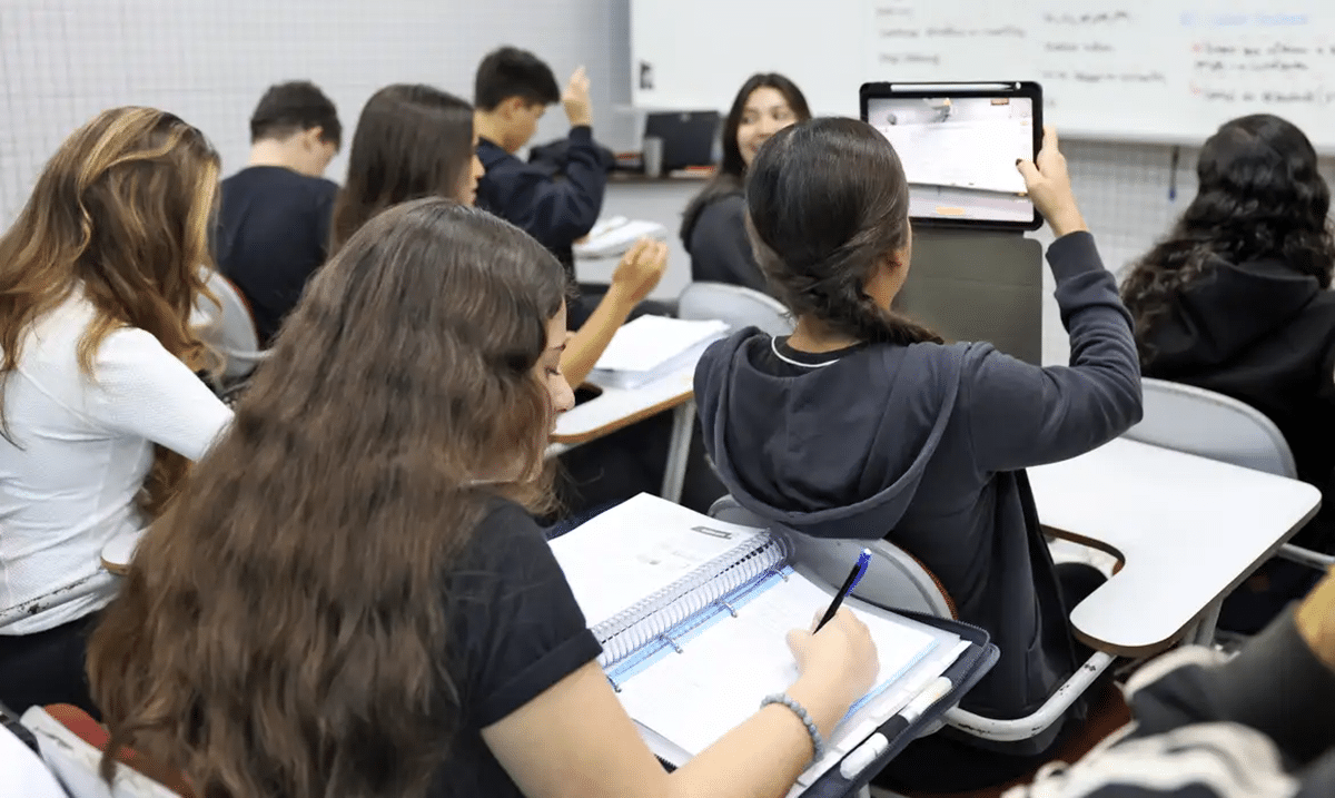 Estudantes do ensino médio em sala de aula acompanhando apresentação sobre preparação para Enem