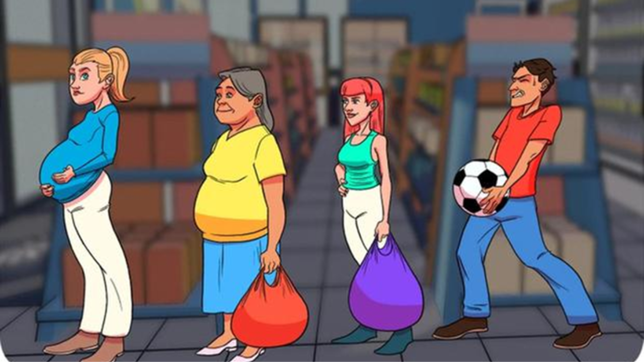 Suspeito 1: é uma mulher grávida. Ela entra na loja com um olhar inquieto e segue diretamente para a seção de frutas. Seria uma mulher grávida capaz de esconder uma melancia sob seu vestido? Ela afirma estar apenas comprando alimentos saudáveis para o bebê que está a caminho.