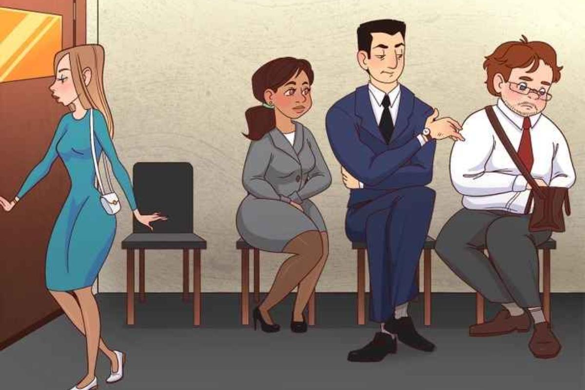 Na imagem, vemos uma cena de entrevista em que quatro pessoas estão presentes. Duas mulheres e dois homens estão aguardando sua vez. Uma das mulheres está se levantando e se dirigindo para a porta, pronta para entrar na sala de entrevistas. As outras três pessoas permanecem sentadas, esperando. Todos parecem estar atentos ao seu entorno, mas há um detalhe sutil que está fora do lugar.
