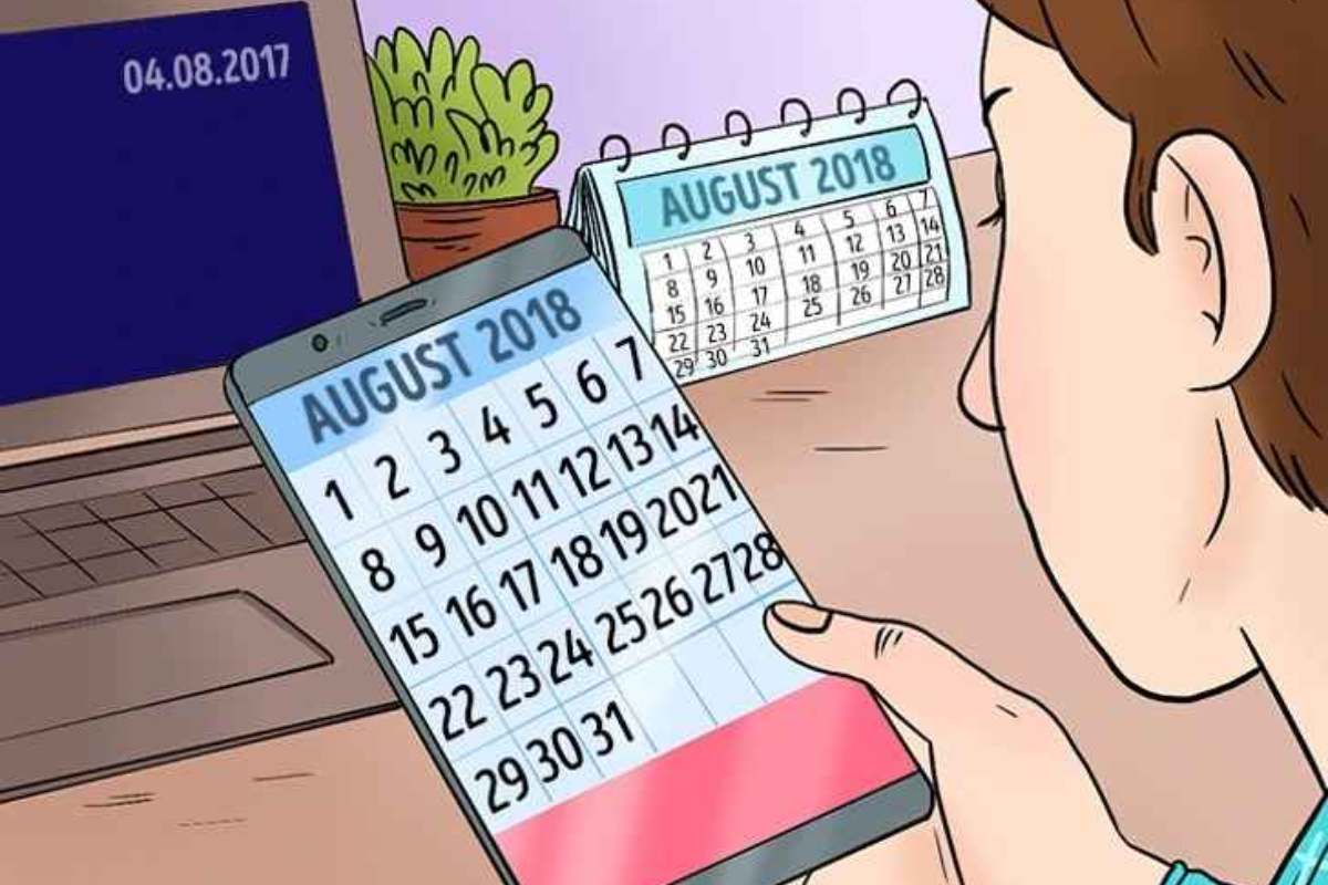 Na imagem, uma pessoa está comparando a data em vários dispositivos. À esquerda, há a tela de um laptop com uma data visível. No centro e à direita, são exibidos dois calendários de mesa para o mesmo mês, ambos mostrando diferentes arranjos de datas. A pessoa também segura um smartphone, que exibe um calendário do mesmo mês destacado em uma cor específica. Além disso, na cena há uma pequena planta ao lado do laptop, adicionando um elemento natural ao ambiente predominantemente focado em tecnologia.