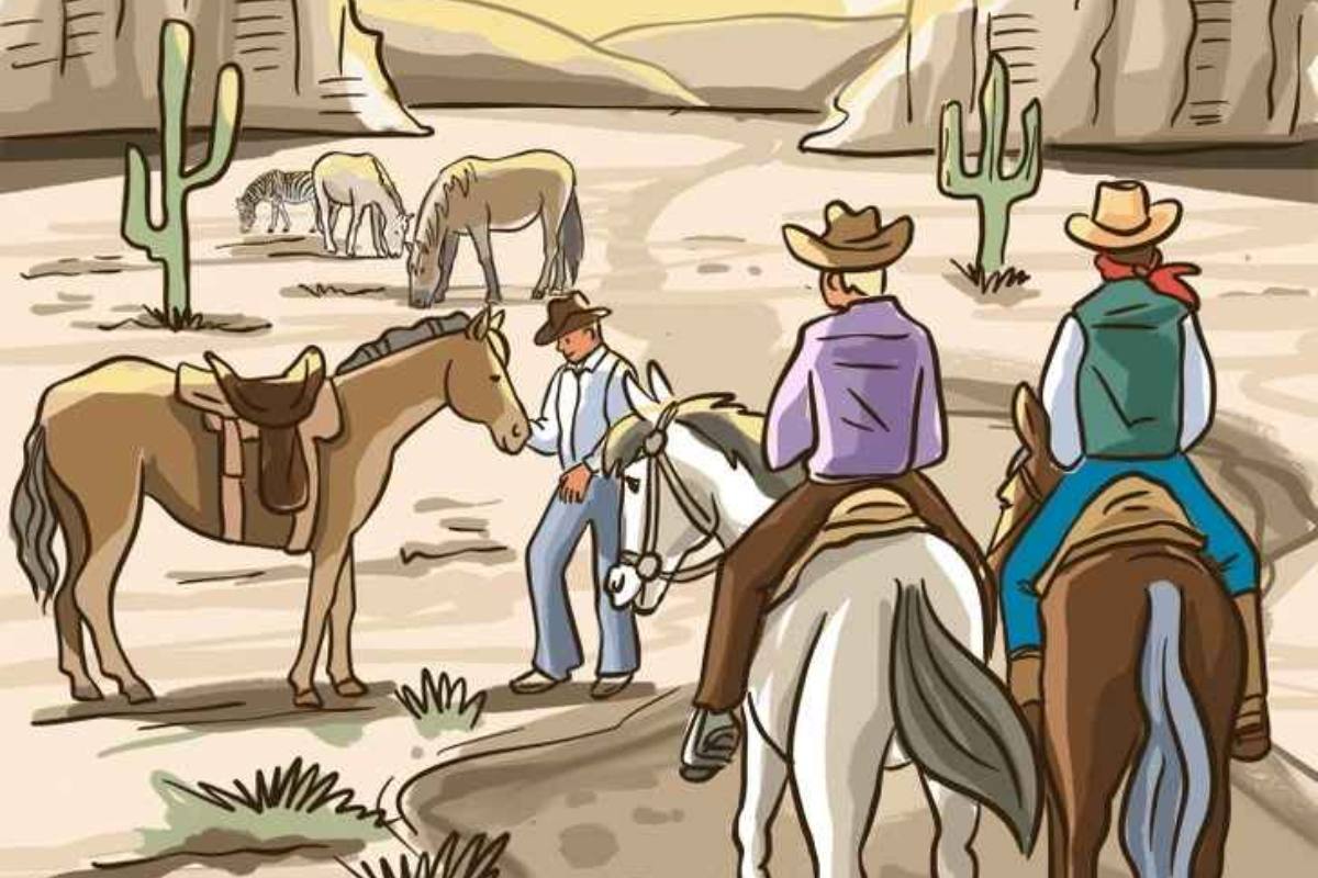 A imagem mostra uma cena no deserto, onde alguns cowboys estão com seus cavalos. Três cowboys são visíveis: dois deles estão montados em cavalos e um está de pé, segurando as rédeas de um cavalo marrom. Ao fundo, há mais cavalos pastando perto de um cacto e de formações rochosas características do deserto. O sol está se pondo ou nascendo, criando um cenário tranquilo e típico do Velho Oeste.