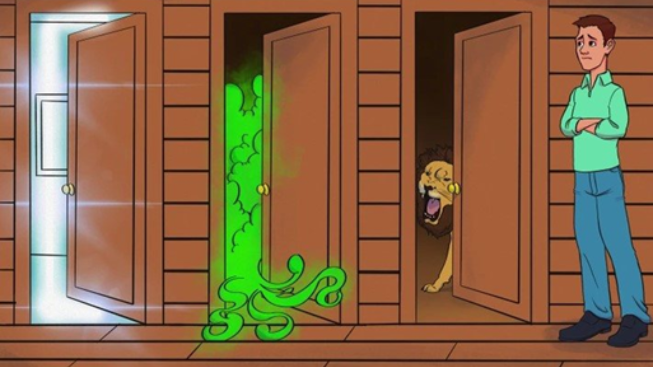 Nesse cenário de desespero, a decisão mais segura seria procurar uma solução alternativa. Ao invés de escolher qualquer uma das portas, o homem precisa encontrar uma maneira de escapar sem se expor aos perigos mortais que se escondem por trás delas.
