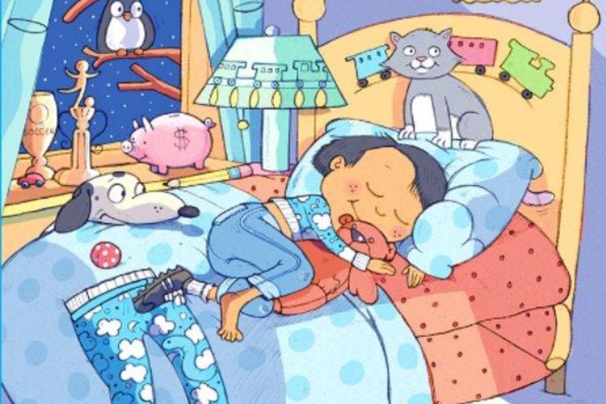 Na imagem abaixo, vemos um menino dormindo confortavelmente em sua cama, abraçado a um ursinho de pelúcia. A cena é composta por diversos detalhes: um cachorro dormindo ao lado do menino, um gato sentado na cabeceira da cama, brinquedos e objetos espalhados pelo quarto, incluindo uma bola de futebol, um cofrinho de porco, e roupas no chão.
