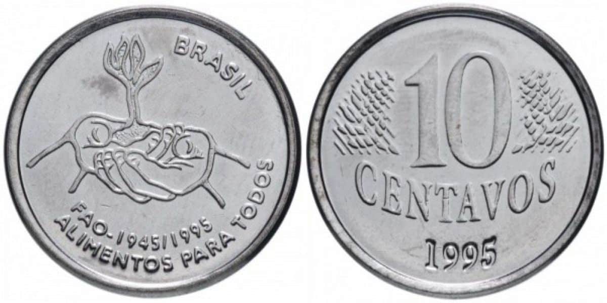 Moeda de 10 centavos FAO de 1995, edição comemorativa com uma tiragem limitada de 1 milhão de unidades. A moeda foi cunhada para celebrar os 50 anos da FAO e sua luta contra a fome. Seu design exclusivo a torna uma peça valiosa para colecionadores. Imagem: Collecione.com
