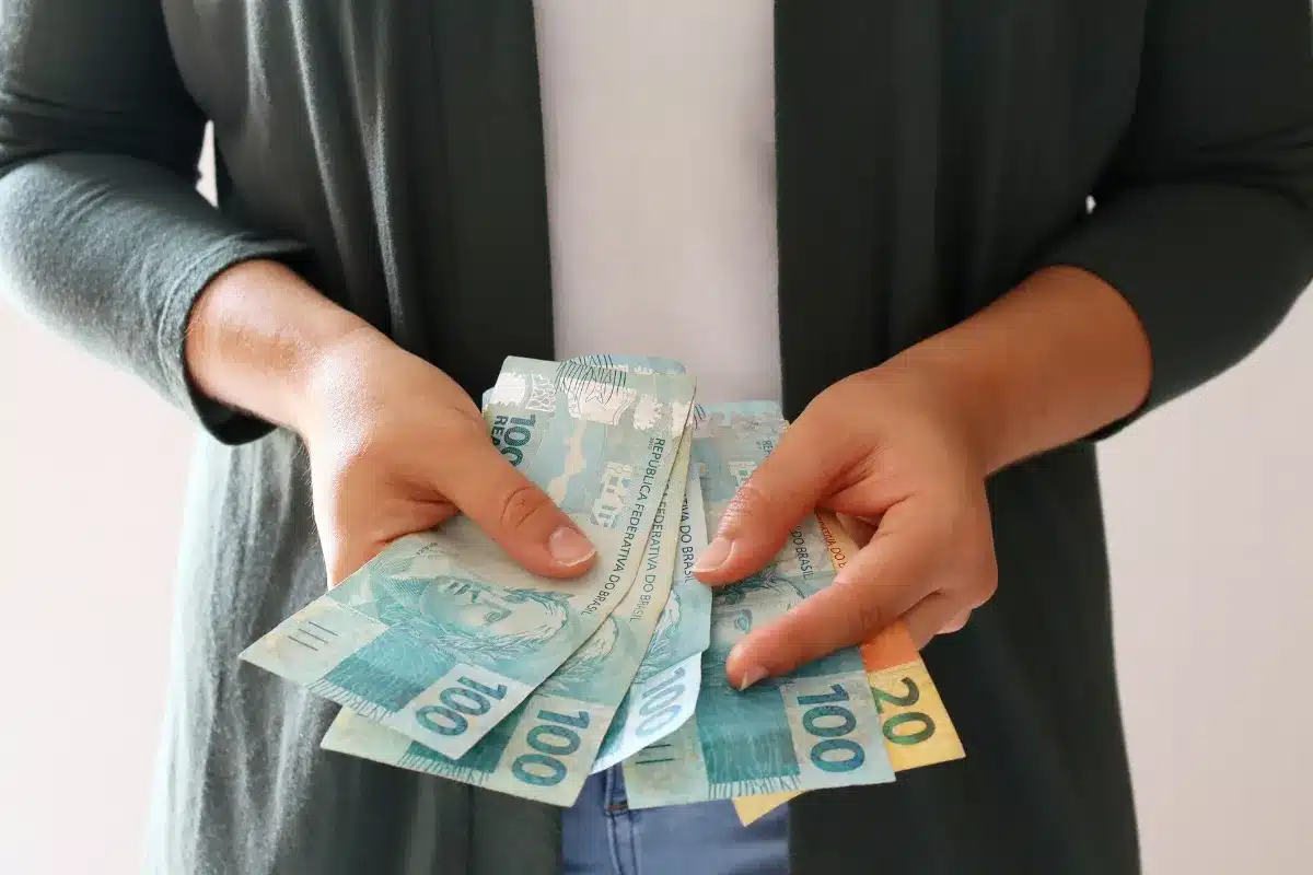 Pessoa segurando notas de R$100 e R$20, representando dinheiro em espécie.