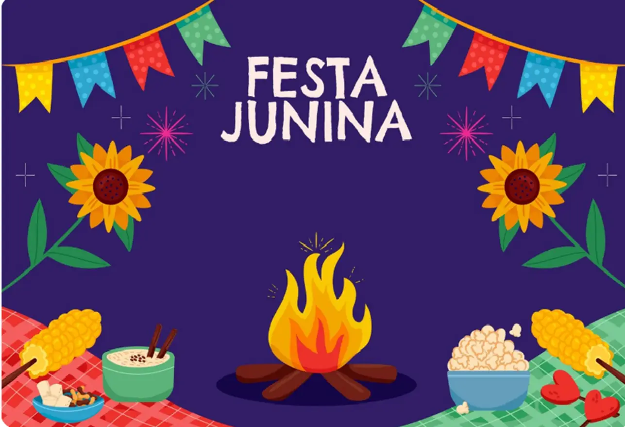 Decoração típica de festa junina com bandeirolas coloridas, fogueira e comidas tradicionais.