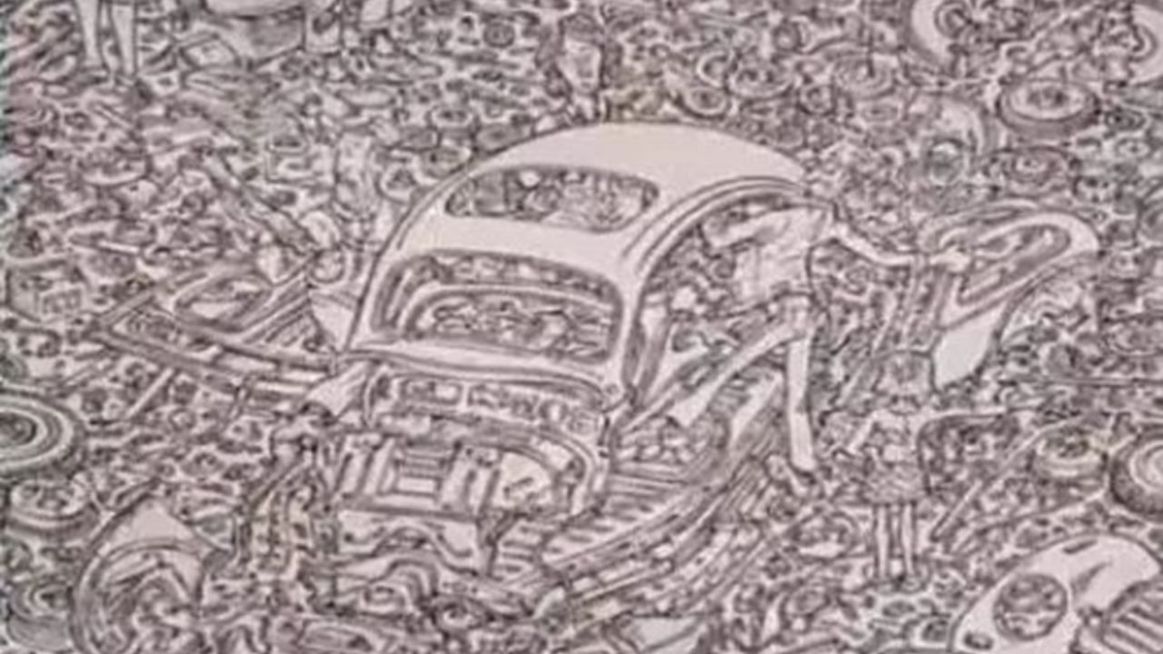 A imagem é um emaranhado de cores vivas, formas complexas e elementos surpreendentes, onde cada pedaço conta uma história. Sua missão é atravessar este labirinto visual e localizar o gato escondido.