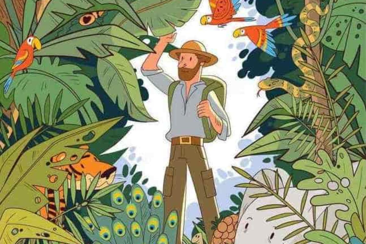 Nesta imagem vibrante e cheia de detalhes, vemos um explorador na selva, cercado por uma rica variedade de flora e fauna. Animais selvagens como um leopardo, macacos, papagaios e um elefante podem ser vistos entre as folhas verdes e coloridas. O explorador está com a mão na testa, possivelmente procurando algo no horizonte.