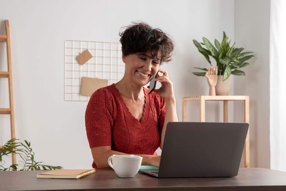 Uma mulher com cabelos pretos curtos e cacheados, vestindo uma blusa de tricô vermelha, sentada em uma mesa de madeira em um ambiente de escritório doméstico bem iluminado. Ela está sorrindo e falando ao celular, enquanto olha para a tela de um laptop cinza aberto. Sobre a mesa há uma xícara branca e um caderno. Ao fundo, vê-se uma estante de madeira e uma planta.