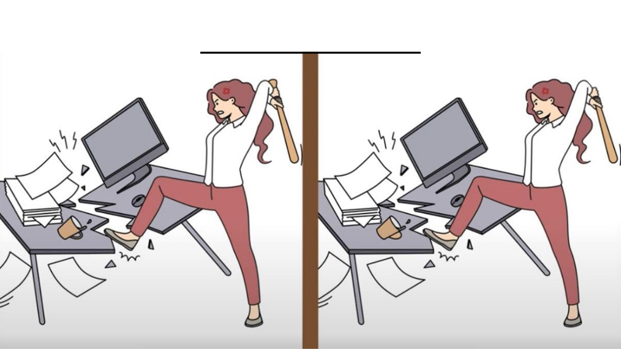 Em um cenário carregado de emoções e intensidade, apresentamos um quebra-cabeça visual desafiador. Nas duas imagens lado a lado, uma mulher furiosa empunha um taco de beisebol enquanto desencadeia sua fúria sobre sua estação de trabalho.