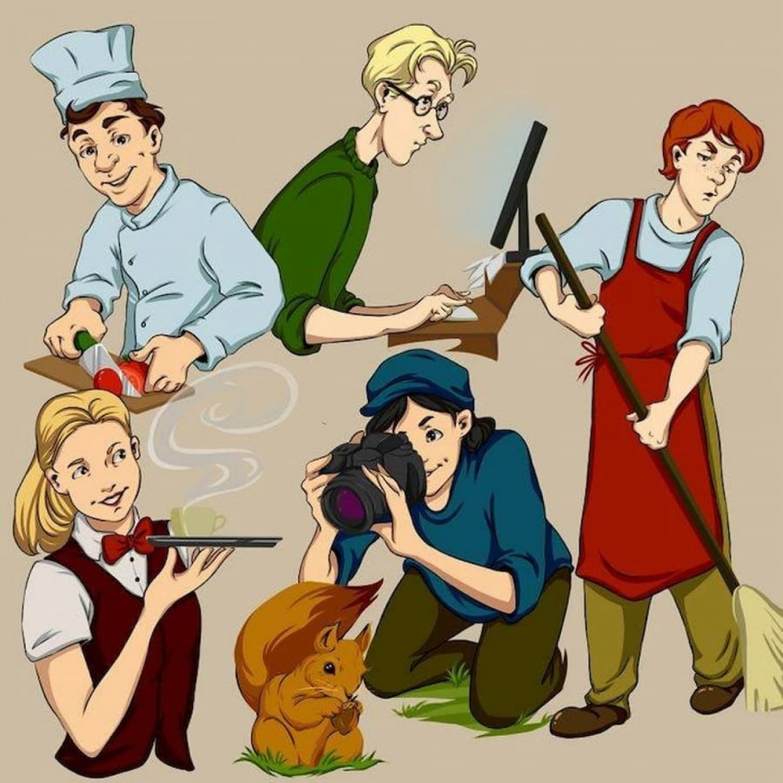 Na imagem podemos observar 5 pessoas e um esquilo. Temos uma garçonete, um chef de cozinha, uma fotógrafa, um faxineiro e um homem usando o computador. Qual dessas pessoas é canhota?