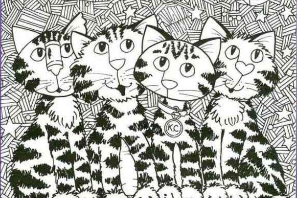 A imagem abaixo mostra quatro gatos sentados lado a lado, com uma série de padrões complexos ao fundo. O cenário é detalhado e apresenta diversos elementos, como estrelas, luas e diferentes texturas, que tornam o desafio ainda mais intrigante. Entre esses gatos e o cenário ao redor, há uma fatia de pizza habilmente escondida.