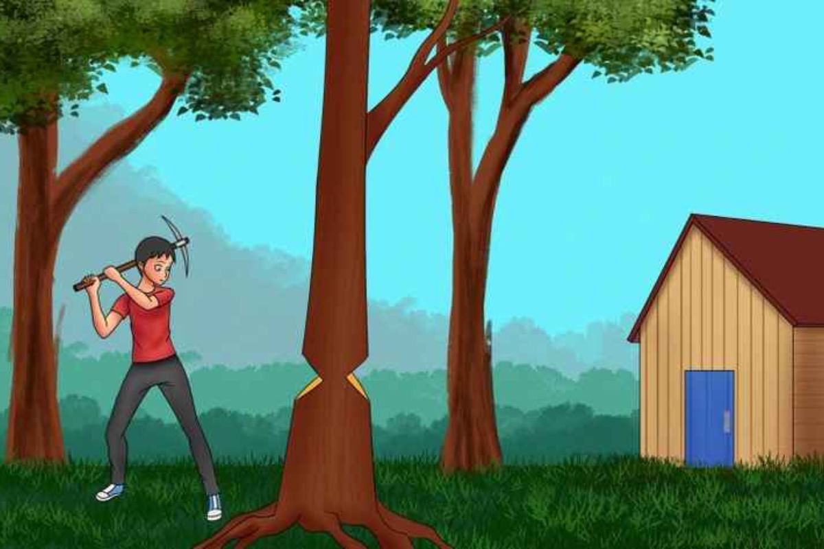 O erro na imagem é que o homem está usando uma picareta para cortar a árvore em vez de um machado! Algo que, logicamente, não faria sentido.