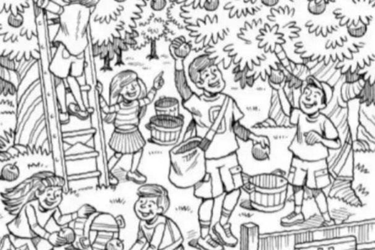 Agora, aqui está o desafio: em algum lugar desta imagem complexa e cheia de detalhes, há um peixe escondido! Parece impossível, mas ele está lá, esperando para ser encontrado. Você consegue localizar o peixe em menos de 15 segundos? Teste suas habilidades de observação e veja se você tem o olhar aguçado necessário para encontrar essa criatura escondida em meio às maçãs e às crianças no pomar. Boa sorte!