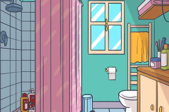 Na imagem abaixo, você vai notar um banheiro agradável e muito colorido. Essa condição é necessária para que a ilusão de ótica aconteça e torne o desafio mais difícil. Portanto, confira: