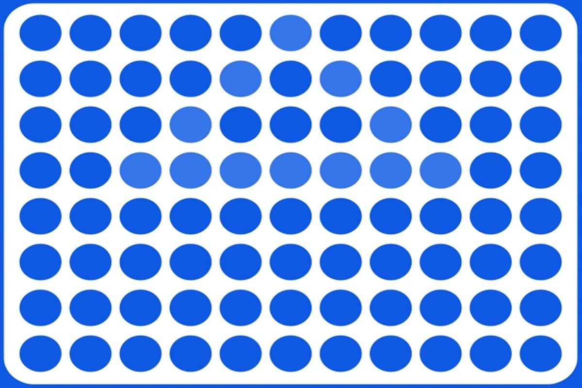 Prepare-se para o desafio de hoje, que vai testar sua percepção! Uma imagem exibe um padrão visual com cantos arredondados, onde pontos azuis estão organizados de forma regular. As tonalidades dos pontos variam entre azul escuro e azul claro, criando uma ilusão visual de movimento ou variação, ressaltando a percepção humana de cor e forma.