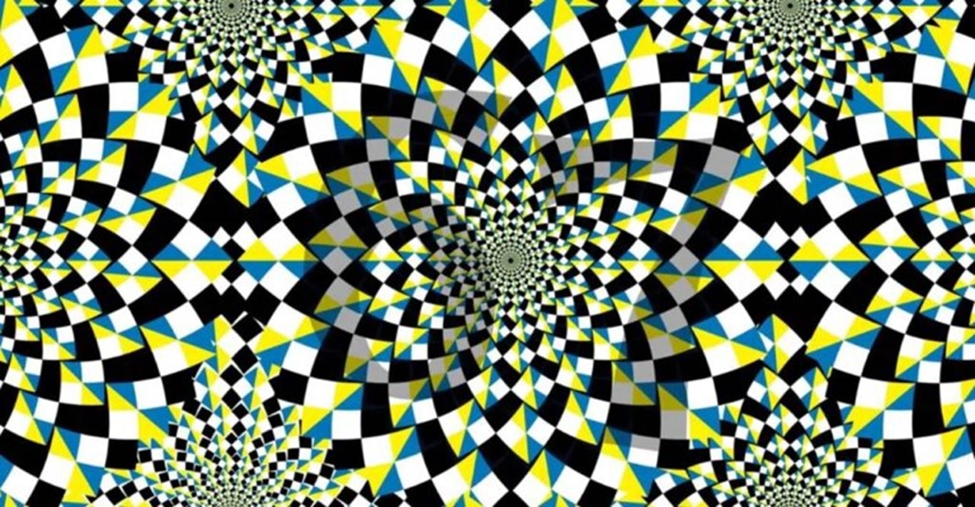 Ilusão de ótica com padrões geométricos coloridos que criam um efeito visual de movimento e profundidade.