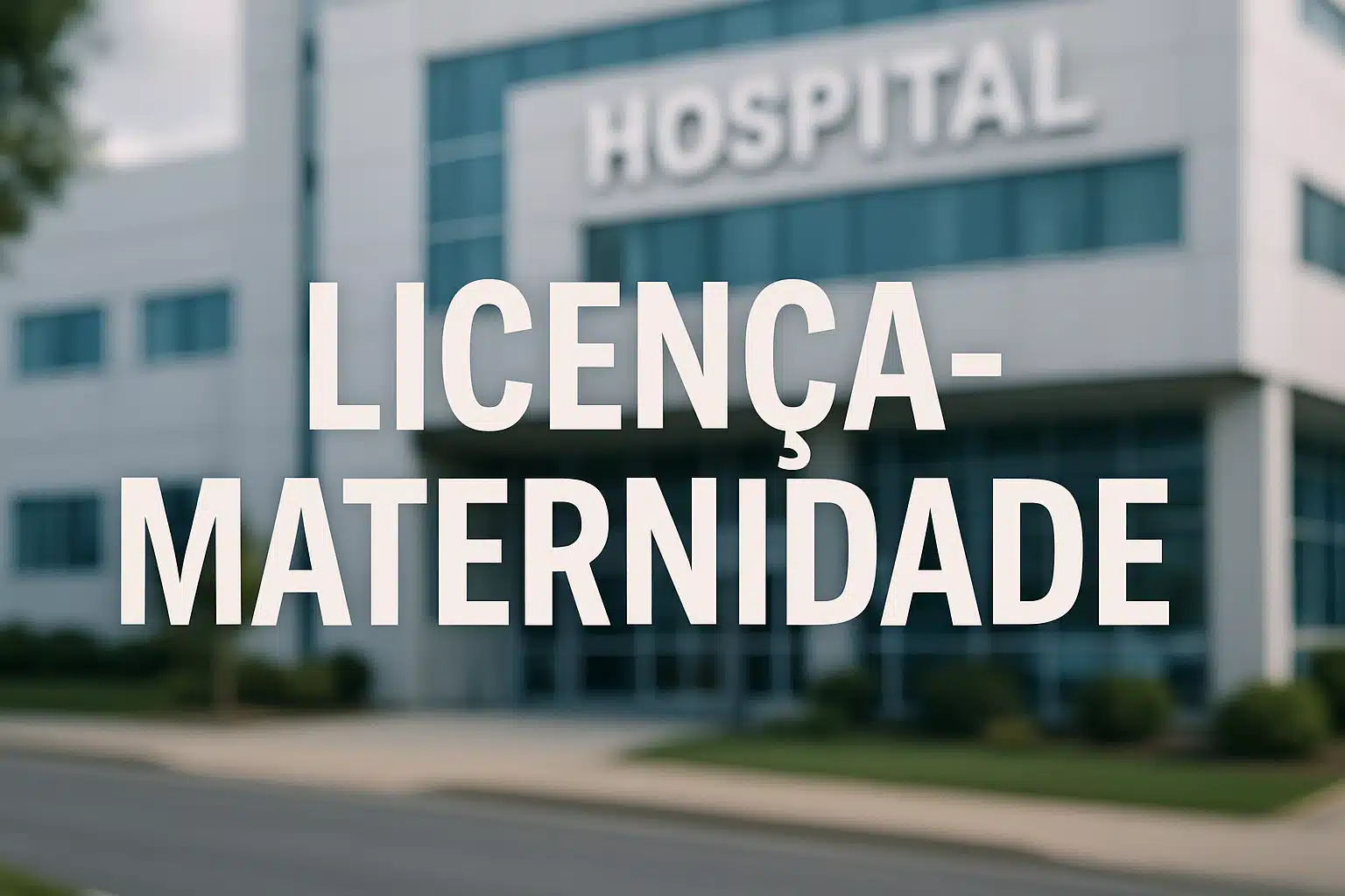 Fachada de hospital com texto 'Licença-Maternidade' em destaque.